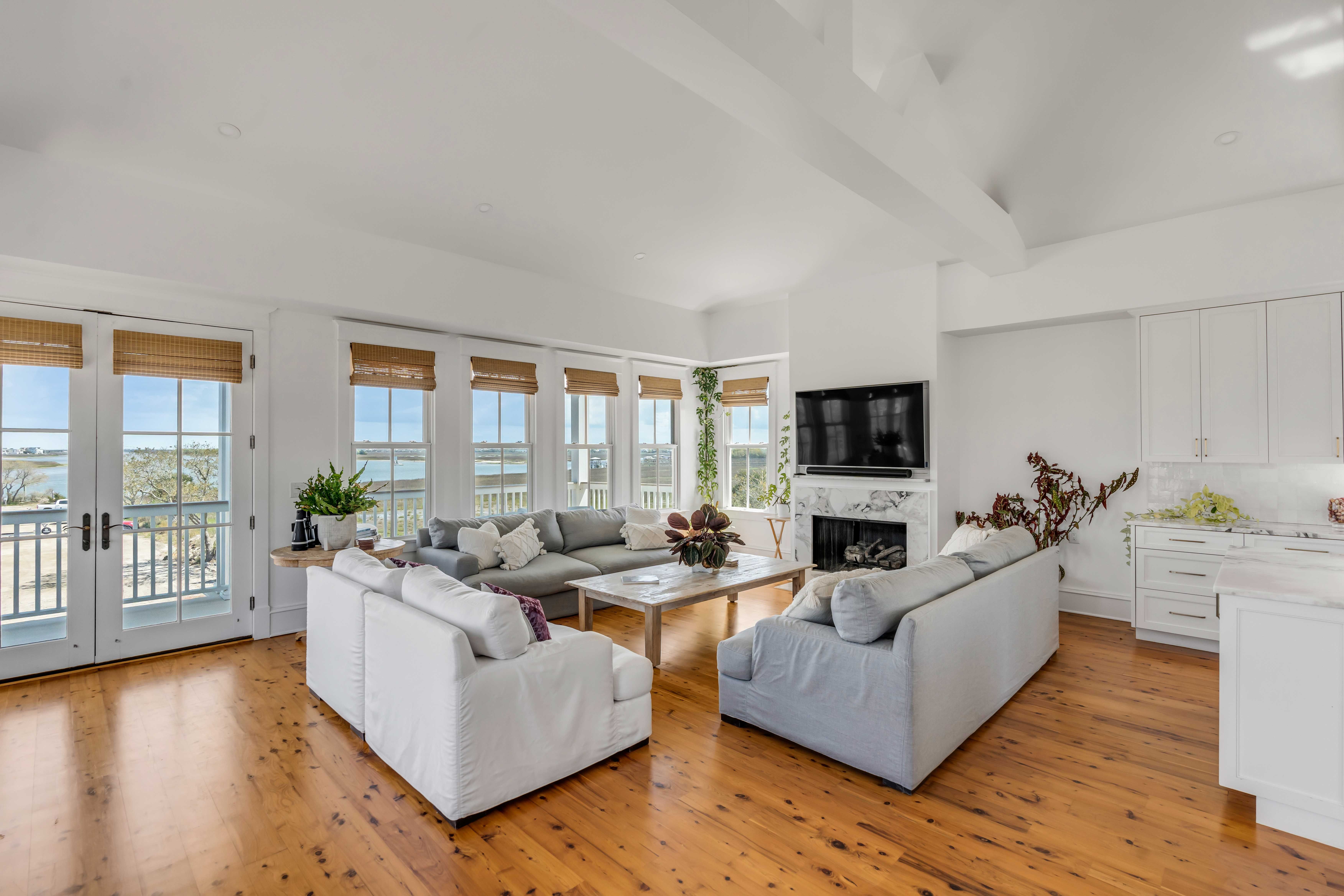 Crafted in the classic Island style with a reverse floor plan, this home is designed to maximize its captivating waterfront views. Soaring 13-foot vaulted and beamed ceilings in the main living area create an airy, open ambiance, while 10-foot ceilings downstairs add to the grandeur.
